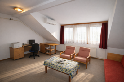 A tetőtérben lévő szoba+fürdő+konyha lehetőséget teremt önálló lakrészként való használatra.
